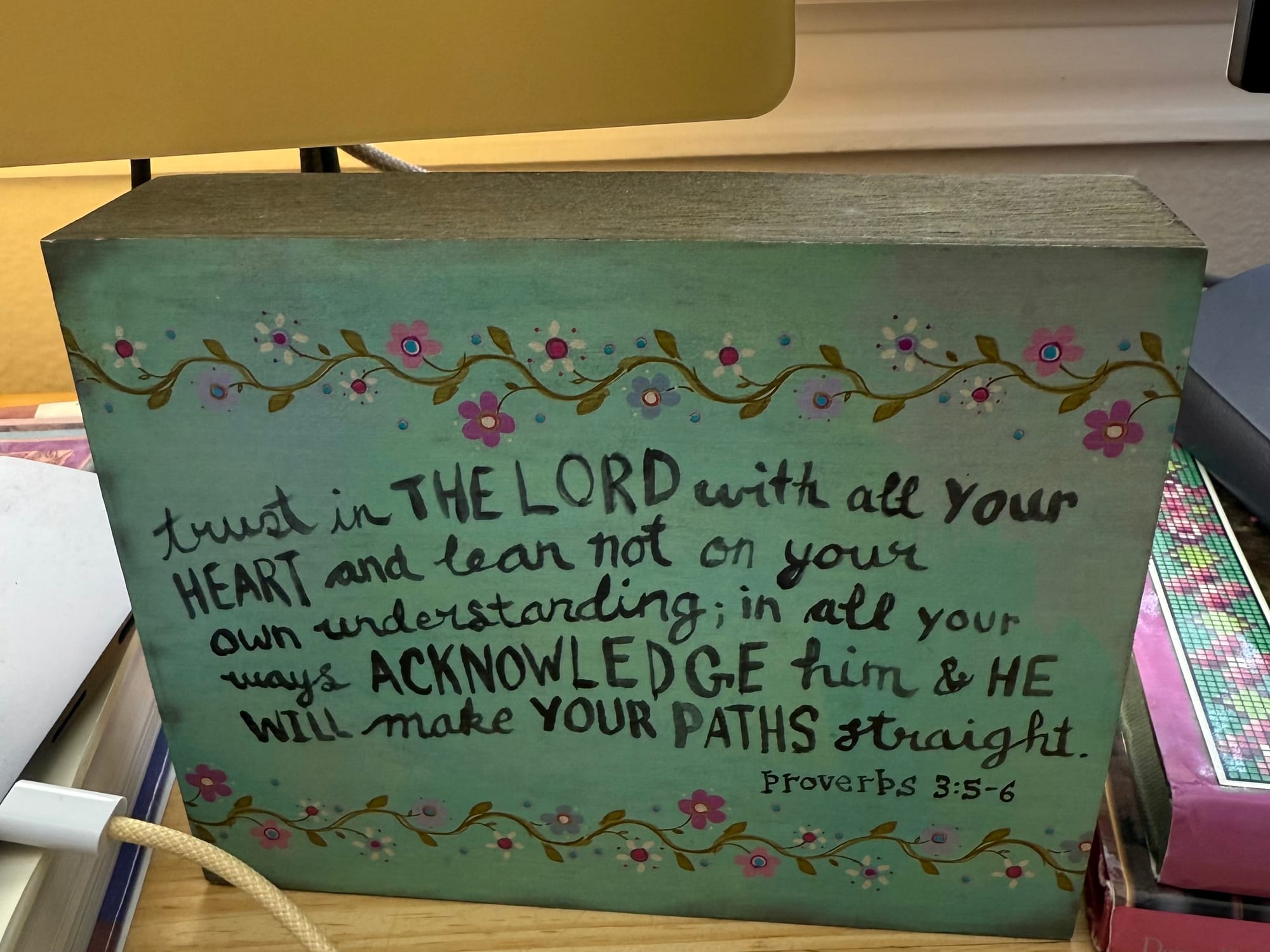 Speaking of little inspirational signs, let's end on a happier note with a photo of the one I keep on my desk just below my monitor, related to the scripture above.
